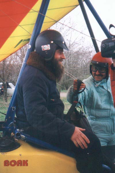 Владимир Яковлев усаживает на свой дельтаплан священника. Все присутствующие с интересом наблюдают за необычным пассажиром.
